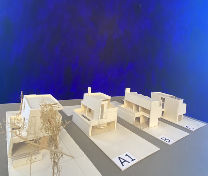 Das Haus ist unterkellert, die Kinderetage im OG birgt neben einem Gemeinschaftsbereich mit Terrasse Rückzugsbereiche in die vier gleichen Kinderzimmer mit großer Verglasung bzw. frz. Balkon und berücksichtigt den Wunsch der Kinder, in diesen Fenstern zu sitzen. Die Eltern haben im DG ihre eigene Ebene mit Sauna und Arbeitsbereich für home-office als Rückzugsort mit großer Dachterrasse sowie einem Austritt vor der Badelandschaft.